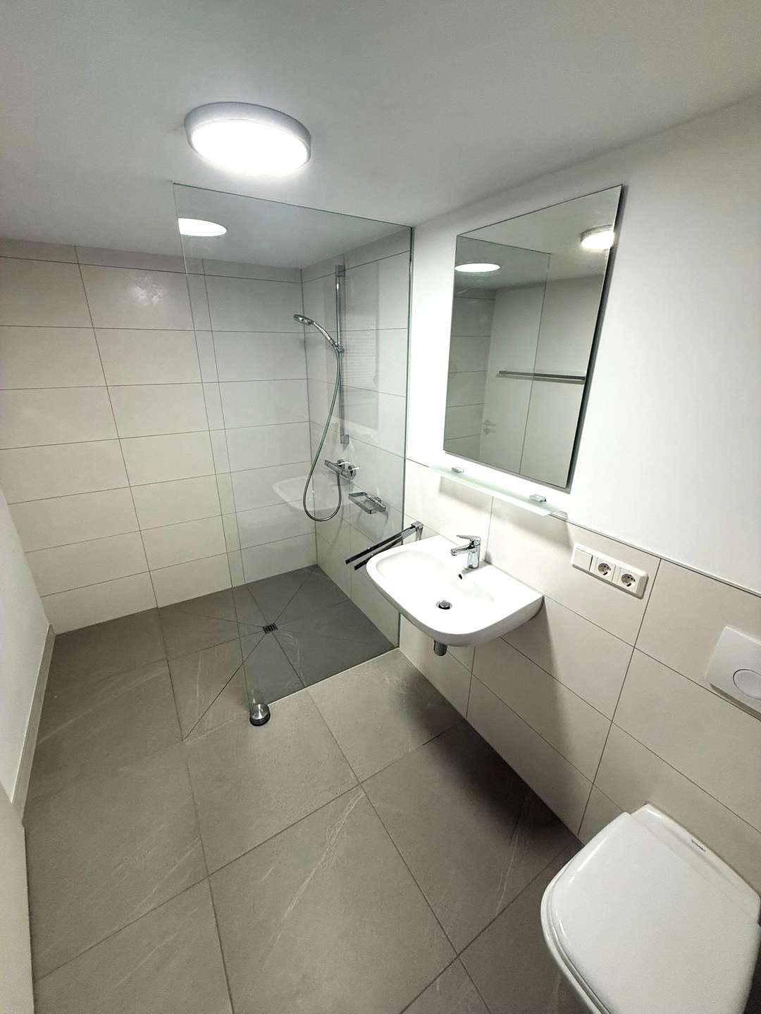- Duschbad mit Fenster, weiß/grau gefliest, moderner Stil
