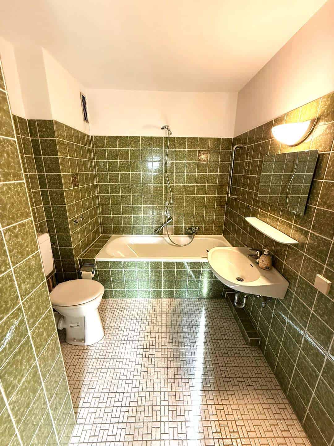 - Olivgrün gefliestes Wannenbad (innenliegend) mit Waschmaschinenanschluss