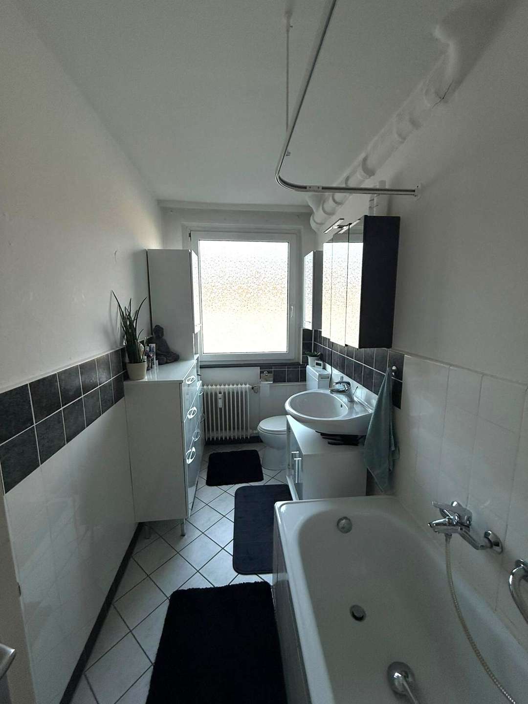 • weiß gefliestes Wannenbad mit Tageslicht