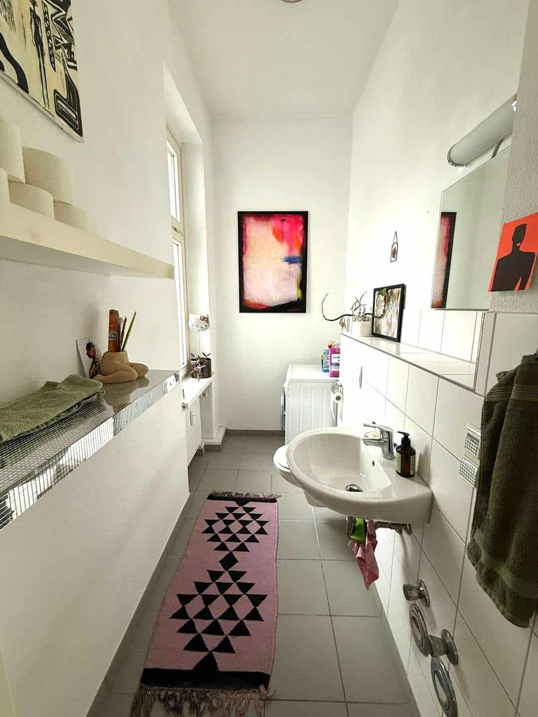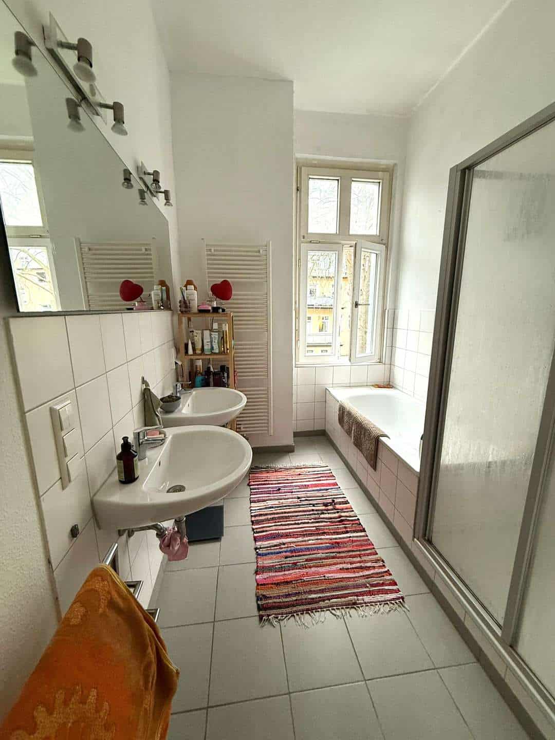 - weiß/grau gefliestes Dusch-/Wannenbad mit Tageslicht und zwei Waschbecken